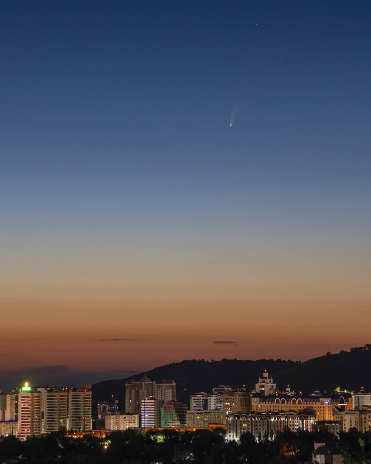"Иногда в небе Алматы можно увидеть уникальные астрономические явления. Например, летом 2020 года мне удалось снять комету NEOWISE на предрассветном небе", - отметил он.