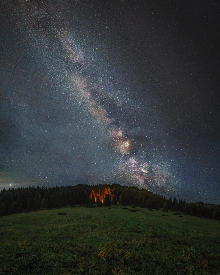 "Фотографировал нашу галактику на фоне леса. Ехал сюда целенаправленно около 60 километров от Алматы, так как это место отлично подходит для съемки ночного неба", - рассказал фотограф.