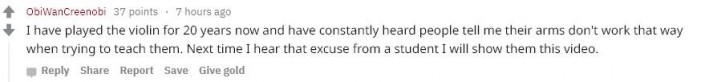 "Я играю на скрипке уже 20 лет и, когда учу людей играть, постоянно слышу, что их руки не работают нужным образом. Когда я в следующий раз услышу эту отговорку от учеников, покажу им это видео".