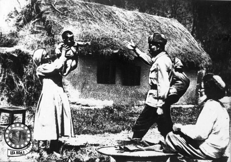 Красноармейца встречает его семья. Колхоз имени Калинина Алма-Атинской области, 1942 г. Из фондов ЦГА КФДЗ РК.