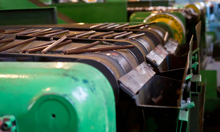 Своей формой станок похож на тот, который делает канавки в дощечках, но у него есть и свои особенности. Заготовки помещают в загрузочный бункер. Они проходят по транспортным узлам, торцуются, пилятся и на выходе получается привычный деревянный карандаш, только еще не окрашенный.