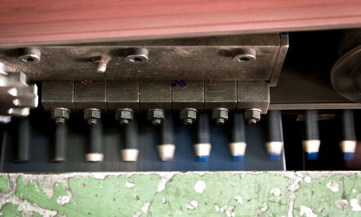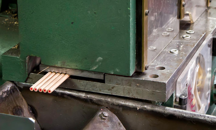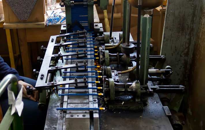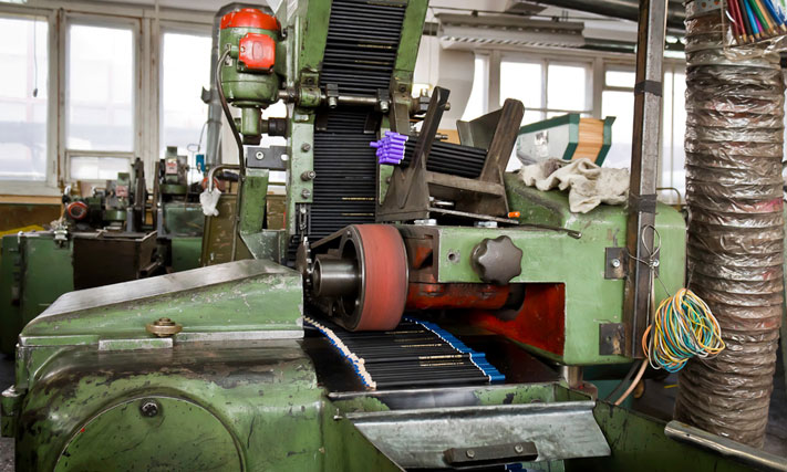 После покраски карандаши отправляют в цех финишной отделки. В этом месте они приобретают тот окончательный вид, в котором дойдут до потребителя. На карандаши наносят штамп, надевают ластик и затачивают.