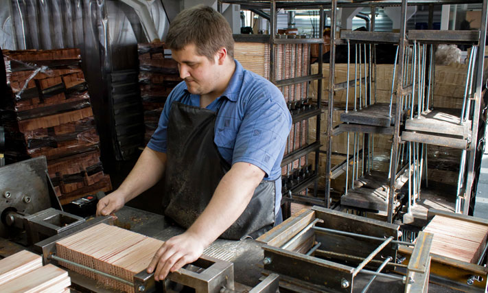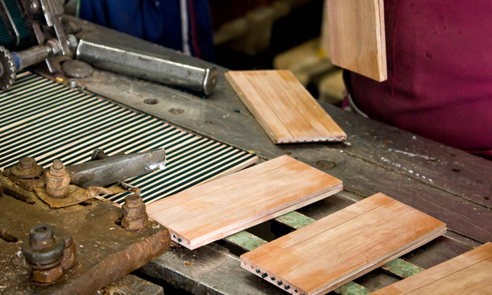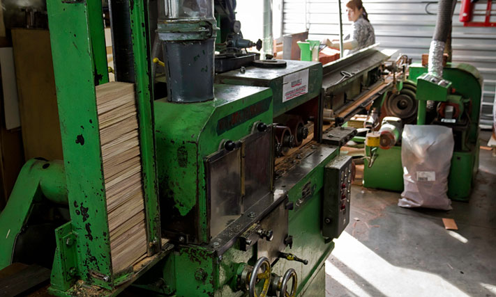 Полученный из бревна брус распиливают на короткие отрезки, каждый из которых затем распускают на десять дощечек. Чтобы все дощечки были одинаковыми, их нужно откалибровать. Для этого их прогоняют через специальный станок. На выходе из него дощечки имеют одинаковый размер и строго перпендикулярные грани.