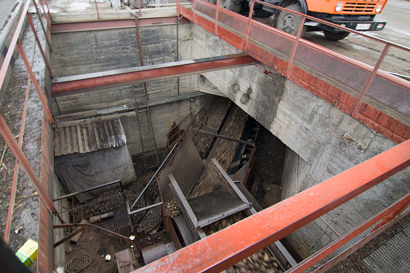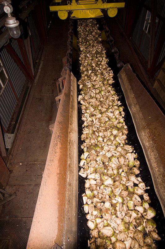 Из бункера корнеплоды попадают на конвейерную ленту, которая уносит сырье в подземелье.