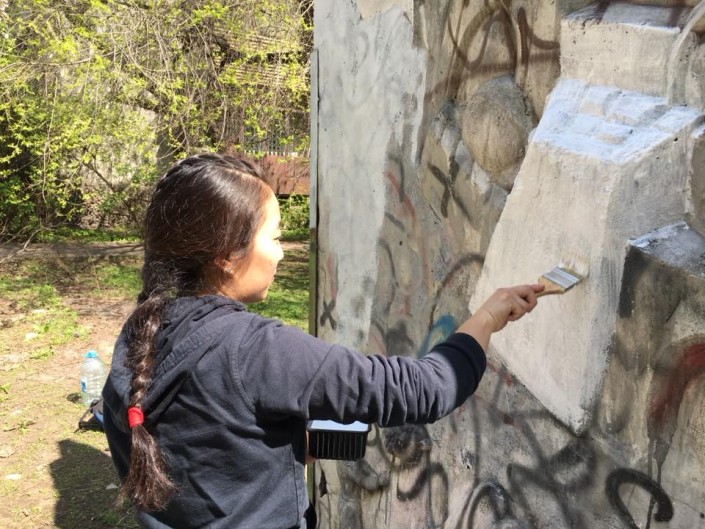 В первый день ребята очистили памятник от разного мусора и покрасили его в белый. Во второй - покрыли яркими красками, следуя эскизу Романа.