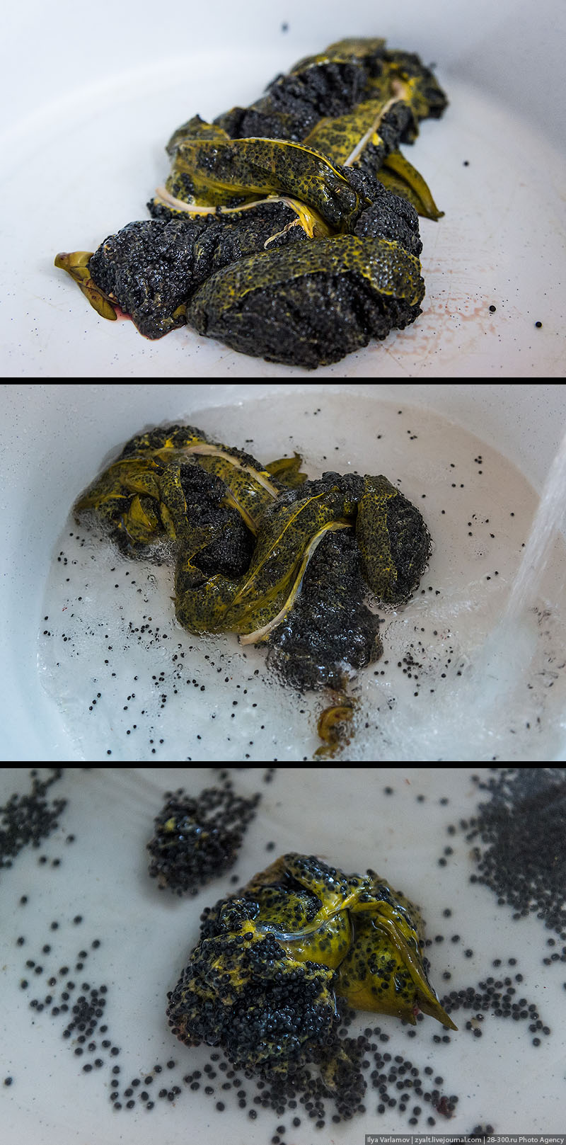 Далее икринки промывают еще три раза. Икра впитывает воду, так что надо делать все очень быстро.