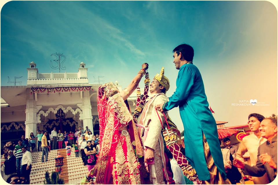 Держа в руках гирлянду из цветов, первый раз они поднимают глаза, чтобы посмотреть друг на друга. Это время для первой символической церемонии обмена гирляндами - джаймала.
