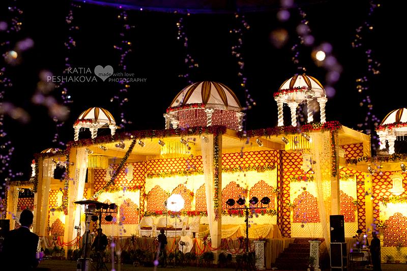 Первое, что бросается в глаза, когда попадаешь на индийскую свадьбу, это количество людей. В России 50 человек гуляющих на свадьбе - это уже много, в Индии же 200 приглашенных гостей - это минимум. Как правило, на территории отеля арендуется сад или, лучше сказать, открытая площадка, которая декорируется цветами и тканью, устанавливаются обеденные столы, специальный постамент для пары, на котором они будут обмениваться свадебными гирляндами из цветов, а потом принимать подарки и фотографироваться с гостями. В то время как на вечеринку подтягиваются гости, невеста готовится к самому главному "выходу" в ее жизни.