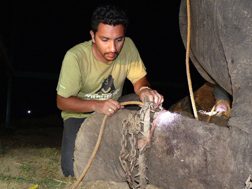 Трогательный момент, когда слон встал на колени, чтобы с него сняли кандалы. Цепи обвивали ноги слона так плотно, что на освобождение от них ушло 45 минут. Когда слон почувствовал себя спасенным, то из глаз у него полились слезы: "Он оказался невероятно чувствительным. Было ясно - слон понимает, что его спасают. Он начал плакать, как ребенок. Впервые в жизни у него появилась надежда", - рассказали спасатели.
