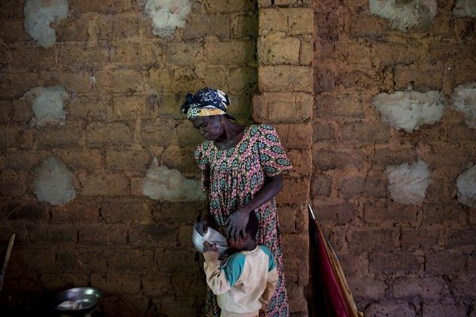 Христианка, нашедшая приют в католической миссии, кормит своего ребенка в Гримари.