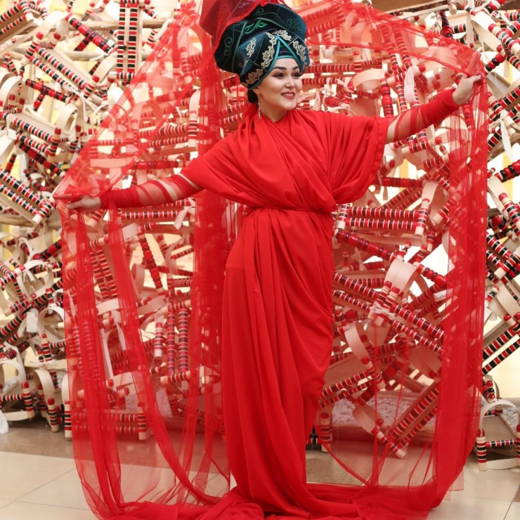 Перформанс проекта "Мой Шелковый путь к тебе" на выставке в проекте Uly dala hikayalary в 2018 году в Шымкенте, в образе Молдир Зияева. ©Алмагуль Менлибаева