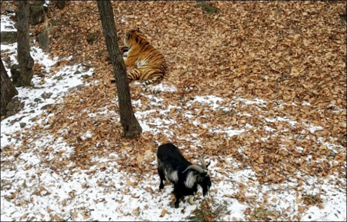Удивительный случай произошел в сафари-парке в Шкотовском районе Приморья (Россия). Амурский тигр по кличке Амур отказался есть живую добычу, которую работники парка приготовили хищнику, - козла Тимура.