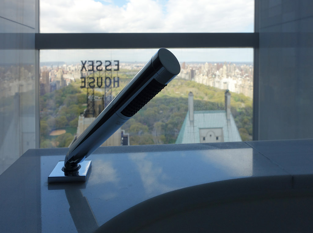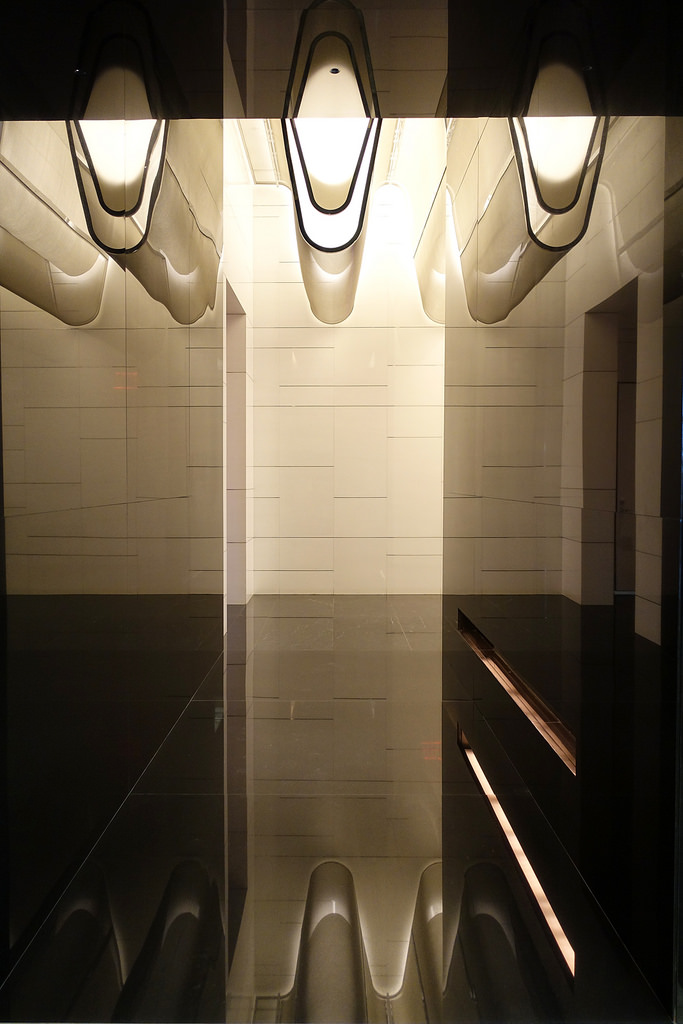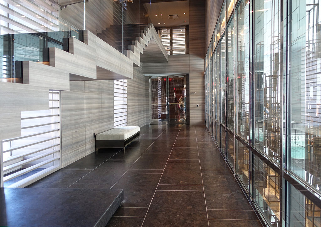 Как я уже писал, внешне One57 мне совершенно не нравится. Но внутри он оказался гораздо симпатичнее, нежели снаружи. Спокойные умиротворенные интерьеры в мягких тонах, все очень лаконично и вместе с тем стильно. В отделке много камня и металла. На стене экраны, которые работают, как живые абстрактные картины. Много черного и темно-коричневого, но мрачности или недостатка света не ощущается. Наоборот, заходишь внутрь с шумной 57-й и попадаешь в спокойное и тихое место, где почти ничто не напоминает о суете за окном. Показать больше фоток холла не могу, так как там просто нельзя фотографировать.