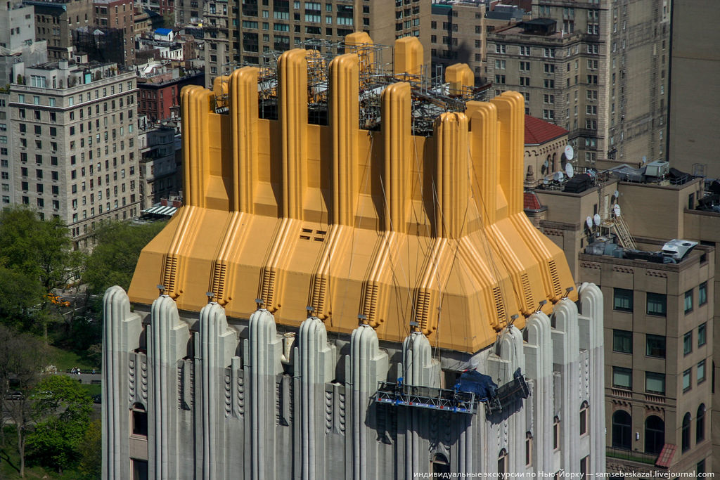 Необычная крыша 38-этажного отеля "Барбизон" (сейчас жилой дом "Трамп-Парк"), построенного в 1930 году. Крыша была выполнена из железобетонных ребер, пространство между которыми было покрыто стеклянными плитками. Днем они сияли на солнце, а ночью подсвечивались изнутри. Во время Второй мировой войны подсветка была запрещена, крышу перестроили и сделали позолоченной. Сейчас она покрашена обычной желтой краской.