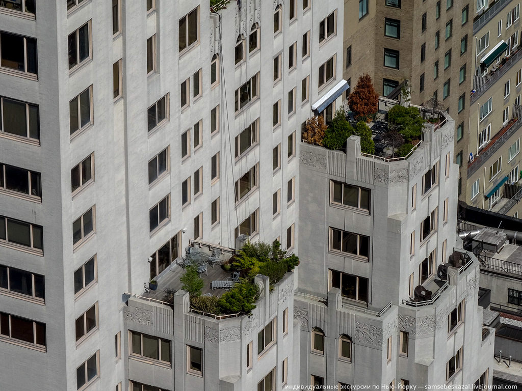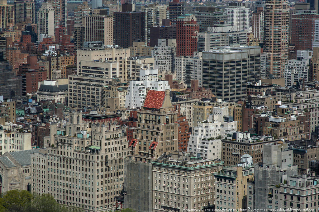 Здание с красной крышей - это 825 Fifth Avenue. 23-этажный бывший апартамент-отель 1926 года постройки. Их строили по всей Америке, но особенной популярностью подобный тип зданий пользовался в Нью-Йорке. Из-за отсутствия кухонь (по концепции жильцы питались в ресторане отеля) подобные здания не попадали под ограничение высотности жилых многоквартирных домов в соответствии с Жилищным актом 1901 года (не выше 45 метров), имели меньше требований по пожарной безопасности и еще несколько послаблений, упрощавших их постройку. Но застройщики проворачивали все так, что после сдачи дома жильцы сами тайно устанавливали кухни и жили в полноценных квартирах.