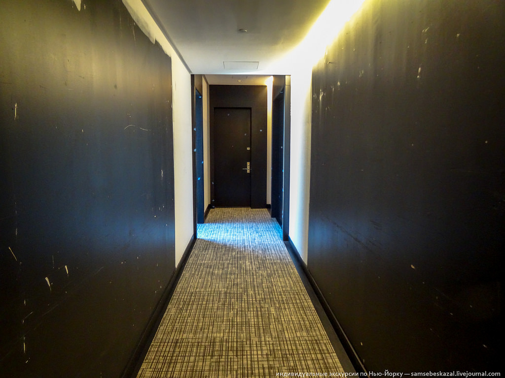 Квартир в доме мало (всего 92), и когда находишься внутри, складывается ощущение, что ты там живешь вообще один. Как-то все так спланировано, что, выйдя из лифта, ты даже не видишь двери соседа, а идешь по длинному коридору к своей. При этом в доме целых три лифта. То есть будущим жильцам ждать его долго не придется. В больших многоквартирных домах на Манхэттене лифт часто является слабым звеном и любая неполадка в его работе приводит к огромным проблемам с доступом в квартиру. Дверь в квартиру - в конце коридора. Как видите, ковролин уже постелили, а стены еще надо доделывать. Ковролин толстый и мягкий. Шагов не слышно совсем.
