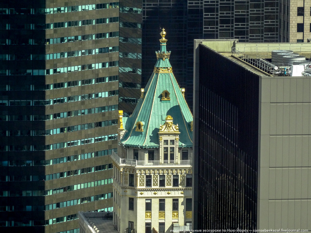 Сверкающая позолотой макушка 25-этажного офисного здания Краун-билдинг, построенного в 1921 году. Это одно из первых в Нью-Йорке зданий, построенных с учетом Закона о зонировании 1916 года, который был важнейшей вехой в развитии городской архитектуры и застройки. В прошлом году оно было продано за 1,75 миллиарда долларов, чем поставило мировой рекорд по стоимости продажи офисного здания.