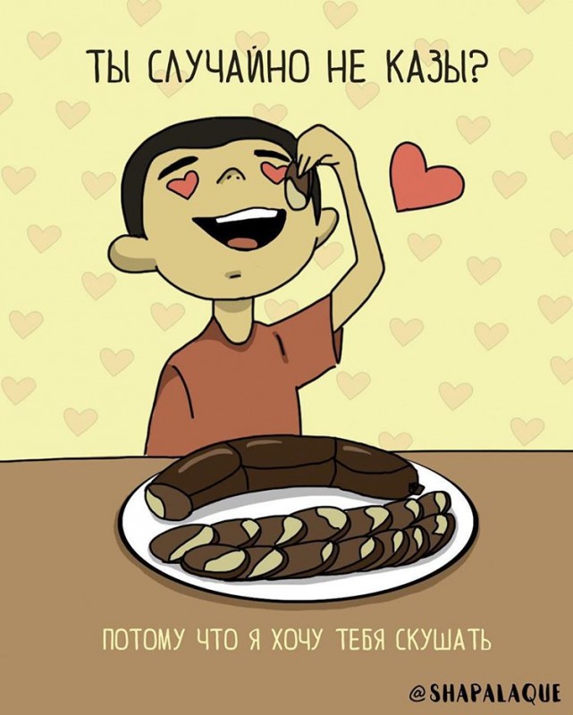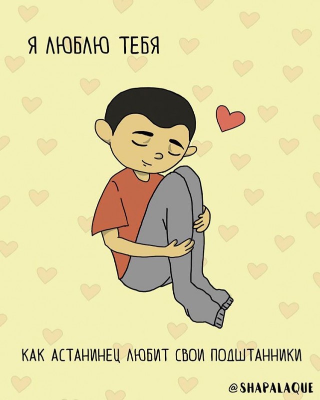 У нас в стране уже есть свой День влюбленных (15 апреля), но многие традиционно отмечают День святого Валентина. И мы в TengriMIX - не исключение. Желаем, чтобы в воздухе и соцсетях всегда витала атмосфера любви, а цветочки с шариками заполняли улицы не только сегодня, но и каждый день. А еще в честь самого романтичного праздника предлагаем вам взглянуть на забавные и оригинальные открытки от казахстанской команды художников Lé Shapalaque Comics, которые вы можете отправить своим вторым половинкам.