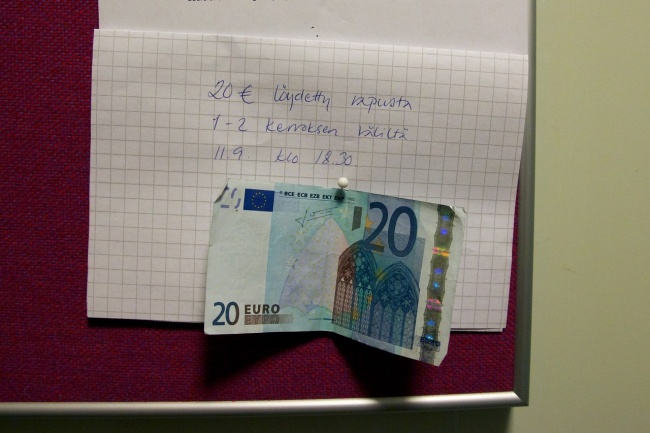 Подъезд дома в Хельсинки. Надпись гласит: "20 евро. Найдены в подъезде между 1 и 2 этажом 11 сентября в 18.30".