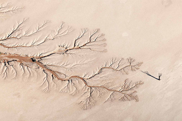 Фотограф запечатлел, как посреди дюн пустыни Намиб тень древнего дерева из верблюжьей колючки тянется к следам высушенной реки Тсошаб. Снимок победил в номинации "Пейзаж".