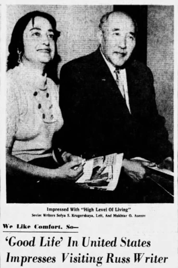 Как Мухтар Ауэзов месяц гостил в США, где задумал свою последнюю книгу Мухтар Ауэзов и переводчик Софья Кругерская©Вырезки из газет