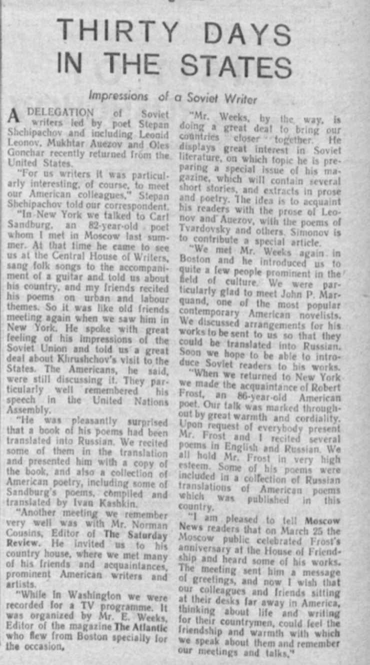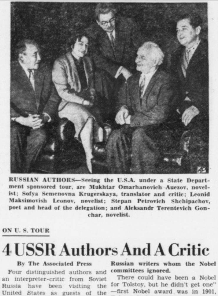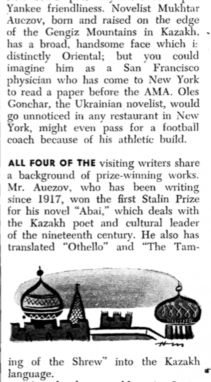 Статья The Associated Press об Ауэзове и его делегации была напечатана в десятках газет в США, 30 марта 1960 года