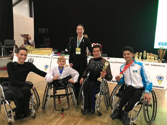 На международных соревнованиях Кубок мира - Кубок Континентов по танцам на колясках. Второй слева Алексей Журавлев, в центре глава Федерации современного и спортивного танца Алия Тусупбекова. Фото © Урджарский ДПМСУ