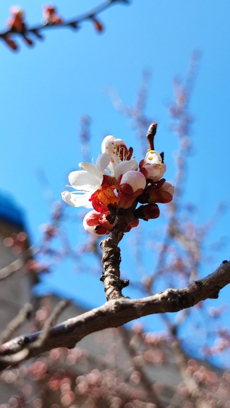 "Это самые первые цветочки, видно, что только начали распускаться, а некоторые еще закрыты. В этом году на неделю позже началось цветение урюка в сравнении с прошлой весной. В прошлом году я делал подобные фото 27 марта в этом же месте", - добавил Дмитрий.