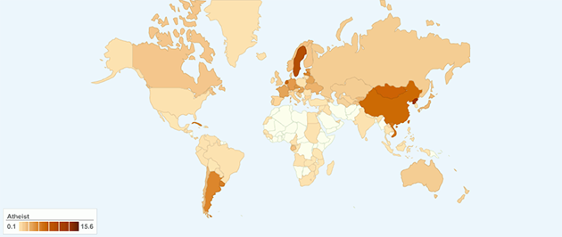 В 2009 году атеистов на Земле насчитывалось 157 529 444 человека, то есть 2,32 процента мирового населения. Страной с самым высоким значением этого показателя является, конечно, Северная Корея (15,6 процента атеистов), второе место занимает Швеция (11,6 процента), третье - Монголия (8,3 процента).