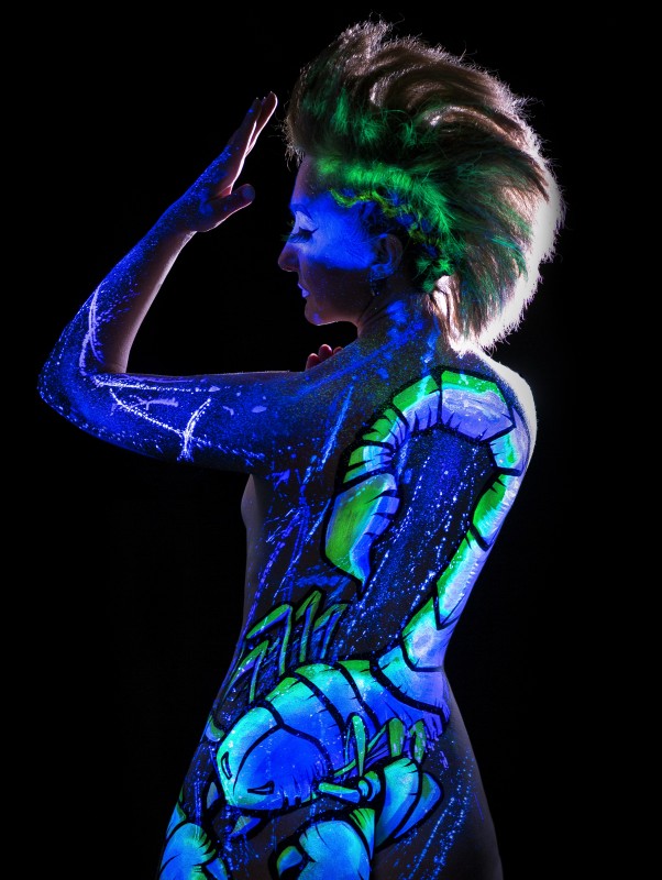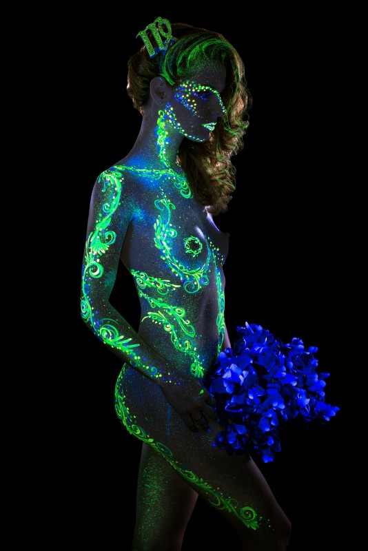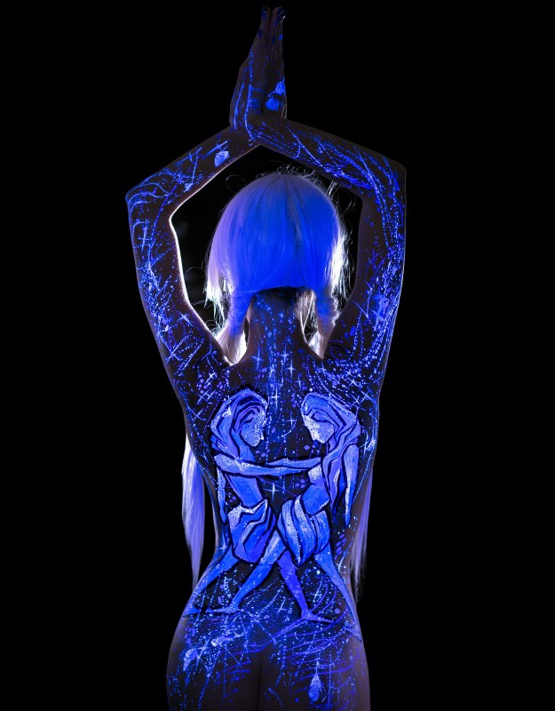 Чтобы перенести космическое "волшебство" на тела моделей, было решено использовать неоновые краски, которые светятся в темноте при специальных УФ лампах. Студия для съемок подготавливалась с особой тщательностью, дабы не потерять естественный силуэт тел и при этом сохранить эффект свечения.