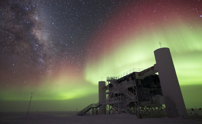 А это - самый большой нейтринный детектор в мире. IceCube, расположенный на Южном полюсе, использует 5 160 датчиков, распределенных среди более миллиарда тонн льда. Цель - получить нейтрино высоких энергий от чрезвычайно жестоких космических источников, таких как взрывающиеся звезды, черные дыры и нейтронные звезды. Когда нейтрино врезаются в молекулы воды во льду, они выпускают высокоэнергетические извержения субатомных частиц, которые могут распространится на несколько километров. Эти частицы движутся так быстро, что излучают краткий конус света, называемый конусом Черенкова. Ученые надеются использовать полученную информацию, чтобы восстановить путь нейтрино и определить их источник.