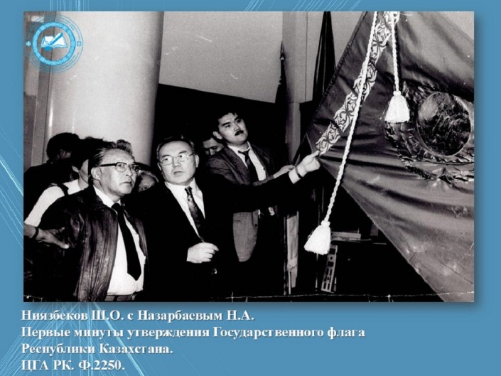 О художнике, чьи работы стали госсимволами Казахстана Ш. Ниязбеков и Н. Назарбаев в первые минуты утверждения государственного флага. ©ЦГА РК