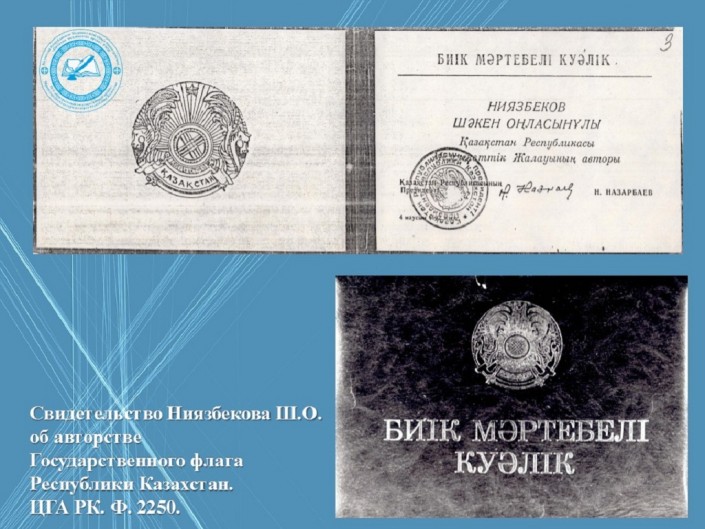 В Центральном государственном архиве РК хранятся документы личного архива главного художника Алматы, автора Государственного Флага Республики Казахстан и герба Алматы, заслуженного деятеля искусств Казахской ССР Шакена Ниязбекова. В фонде содержатся документы деятельности художника (наброски, отдельные зарисовки, эскизы), материалы к биографии, статьи разных авторов о его творчестве и фотографии.
