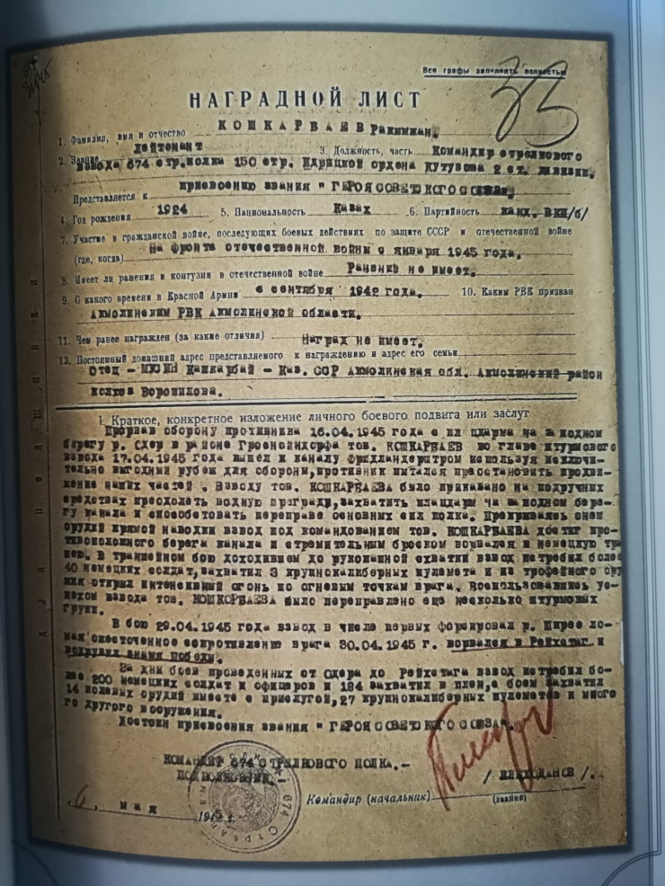 Оба документа подписал командир 674-го стрелкового полка подполковник Алексей Плеходанов 17 апреля и 6 мая 1945 года. 22 апреля командир 79-го Берлинского стрелкового корпуса 3-й ударной армии 1-го Белорусского фронта генерал-майор Семен Переверткин подписывает приказ о присвоении Рахимжану Кошкарбаеву и трем его сослуживцам ордена Отечественной войны I степени и еще шестерым - ордена Отечественной войны II степени.