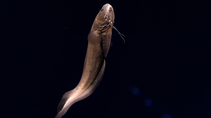 А это - костистая рыба, представитель семейства ошибневых (Ophidiidae), привлеченная огнями подводного аппарата. Снимок сделан на глубине 1840 метров.