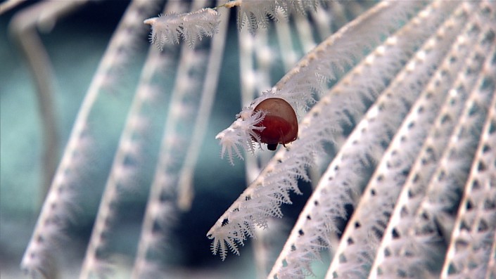 Одно из самых необычных животных - коричневый голожаберный моллюск. Обычно на такой глубине их не встречали, однако в этот раз исследователям повезло обнаружить особь длиной 10 сантиметров. Эти обитатели напоминают морских слизней, но лишь отчасти: в отличие от последних, природа снабдила их раковиной - которую они, впрочем, сбрасывают после личиночной стадии.