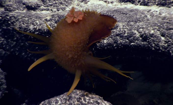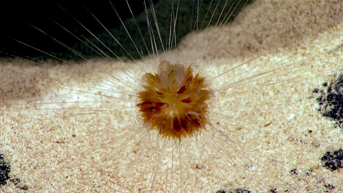 Сифонофор-"одуванчик" был впервые обнаружен учеными NOAA лишь во время этой экспедиции. Его нашли на глубине 2530 метров и, присмотревшись, можно заметить тонкие щупальца, которая окружают тело животного как паучья сеть. Пульсирующие нектофоры (плавательные колоколы) в центре создают иллюзию того, что сифонофор "подвешен" на своих же собственных щупальцах.