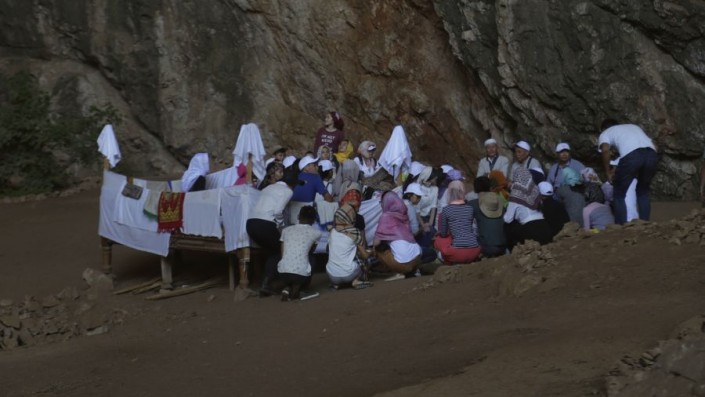 Прочитав молитву у могилы "Святой матери", участники фестиваля направились в подземную пещеру "Ак Мечеть" в Байдибекском районе.