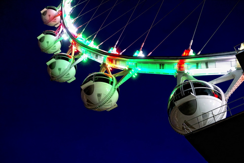 В Лас-Вегасе открылось самое высокое на планете колесо обозрения. Называется оно - HighRoller, его высота - 165 метров. Колесо состоит из 28 стеклянных кабин с кондиционерами, в каждой помещается 40 человек. Полный оборот гигантское колесо совершает за полчаса. Билеты стоят 24,95 доллара днем и 34,95 - ночью.