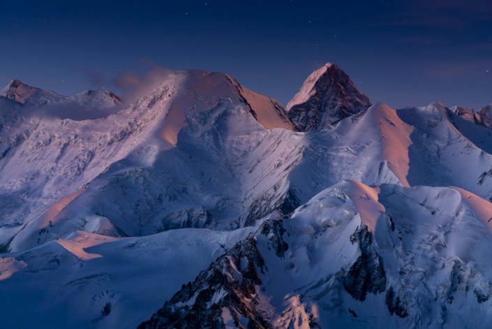 Слева направо: Пик Баянкол (5791 м), пик Хан-Тенгри (7010 м), пик Одиннадцати (5437 м). Центральный Тянь-Шань. Ущелье Баянкол. Снято с вершины пика Мукагали (4433 м) в предрассветных сумерках. Август, 2018 год. © Ольга Кулакова.