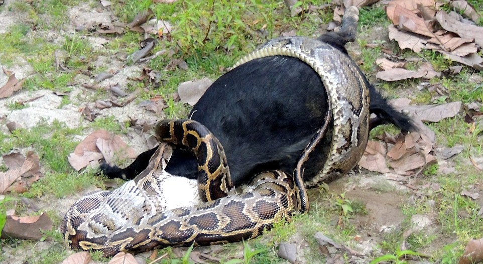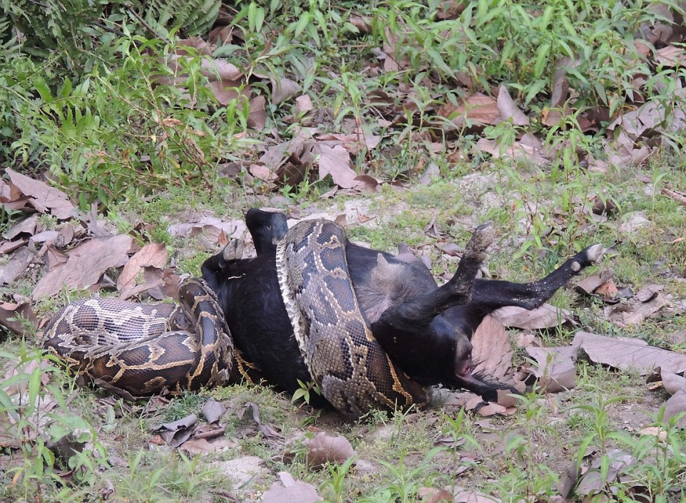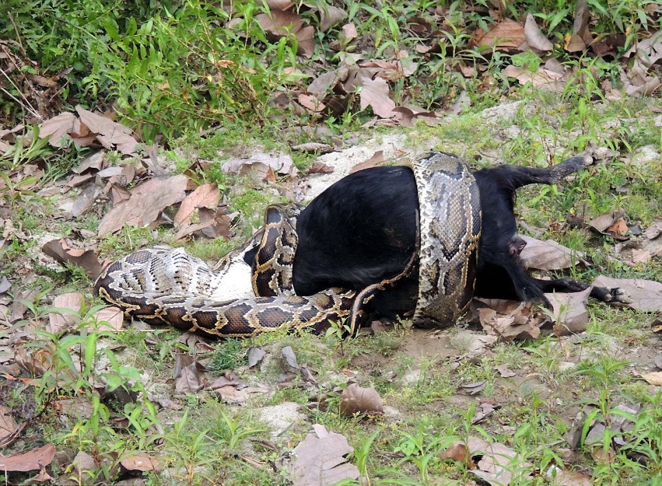 Драматические кадры из жизни дикой природы удалось снять индийскому фотографу Рони Чоудхури в заповеднике в штате Западная Бенгалия. Гуляя в лесу, мужчина наткнулся на толпу селян, собравшихся в круг и что-то громко обсуждавших. Подойдя ближе, фотограф увидел питона, который медленно поглощал только что пойманную домашнюю козу.