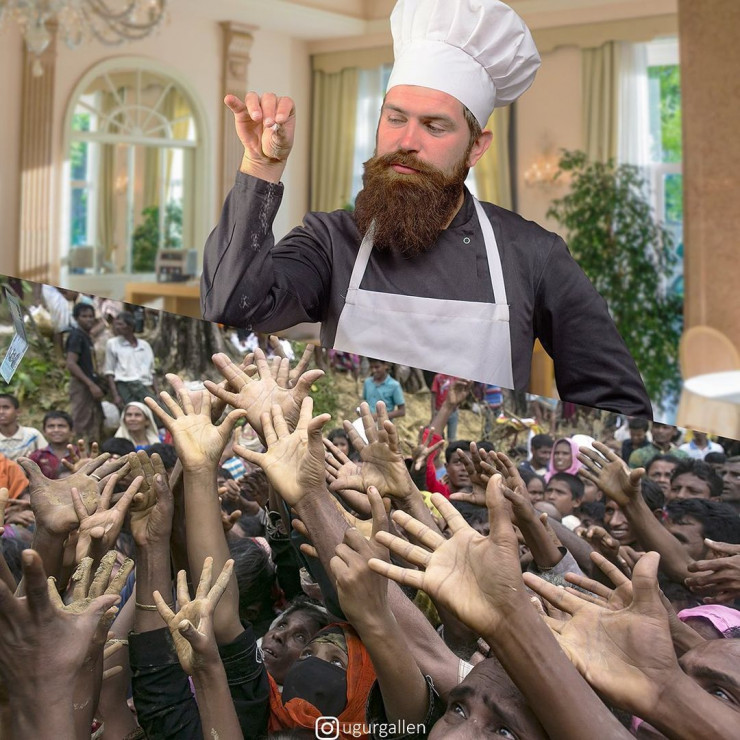 "Я создаю коллажи из двух изображений, соединяя работы самых бесстрашных современных фотожурналистов. Пытаюсь поднять важные проблемы, с которыми сталкивается мир: социальная несправедливость, войны, изменение климата и т. д. Стремлюсь показать контрасты между двумя разными мирами, в которых мы живем", - говорит Угур.