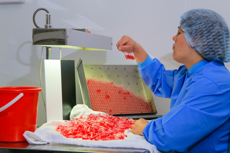 Перед тем как зайти в цех, говорит Забира, сотрудники принимают душ и переодеваются в специальную одежду. Надевают бахилы и шапочки, обрабатывают руки дезинфицирующим раствором. На заводе стерильная чистота.