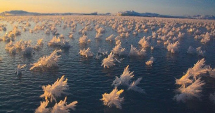 Когда холодный влажный воздух над поверхностью воды насыщается, из любых дефектов на поверхности воды начинают формироваться кристаллы льда. Только в этот раз они принимают форму цветов, а влага в воздухе помогает им расцветать.