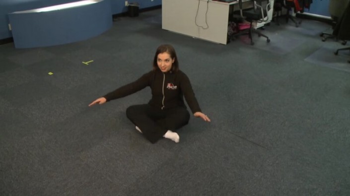 Из этой позиции начните медленно садиться. Нельзя помогать себе руками, коленями или как-то еще, также нельзя просто плюхаться на пятую точку, это считается за ошибку. Если вы все же используете опору, то теряете один балл. Если вам удалось сесть таким образом, но вам сложно удержать баланс, отнимается полбалла.