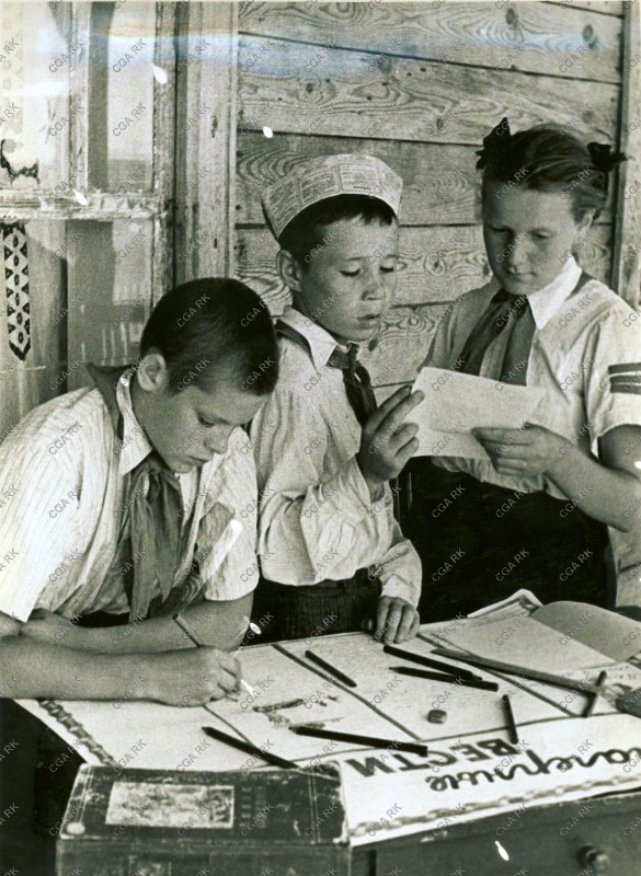 Члены редакционной коллегии в творческом процессе. Пионерский лагерь Семипалатинского обкома профсоюза медработников, 1957 год. Из фондов Центрального государственного архива Республики Казахстан