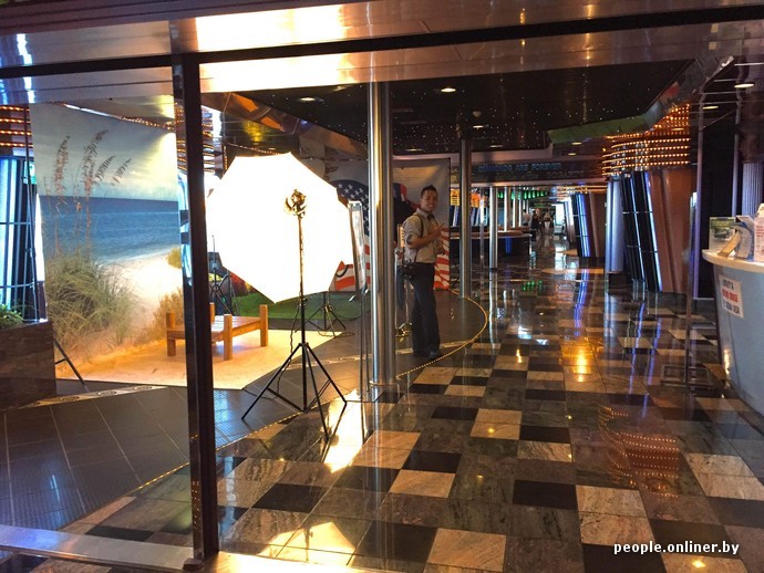 Перерыв на ужин - минут 30. Сначала казалось, что за такое время точно не успеешь сбегать в каюту, переодеться, залететь в столовую и поесть. Но вскоре приспособился. После ужина отдаешь флешку на печать, берешь новую, приделываешь вспышку - и идешь фотографировать портреты в ресторан. Еще один короткий перерыв, снова на "пост". В 10.30 вечера подходит менеджер, спрашивает, сколько у кого фотографий за день. Если мало, придется стоять до 11. Потом складываем декорации, заносим в кладовку и закрываем галерею. Другое дело, когда работаешь в галерее. Все более спокойно. Пробиваешь фотографии, "толкаешь" всяческие "пакеты". Не напрягаешься.