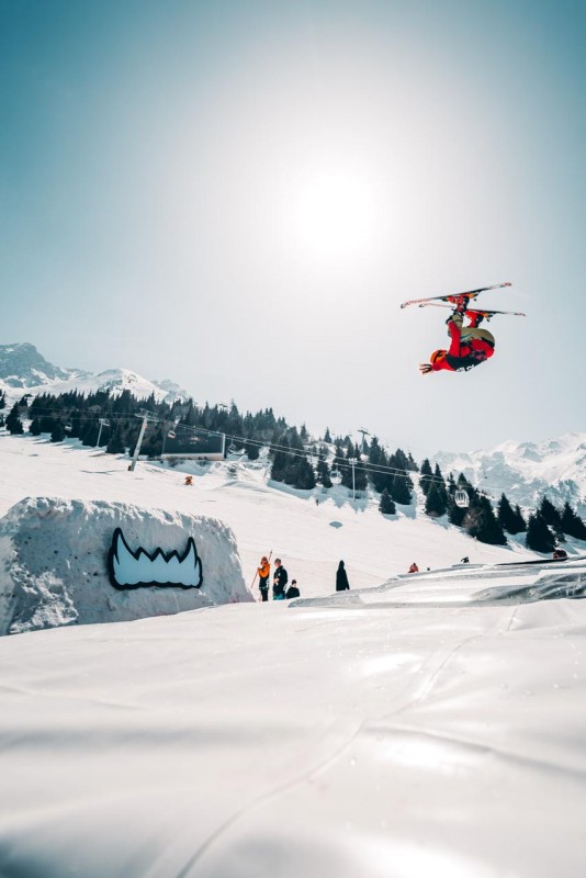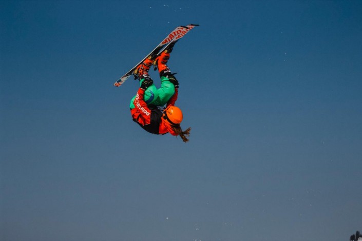 Еще спортсменка проделывает на лыжах крутые трюки.