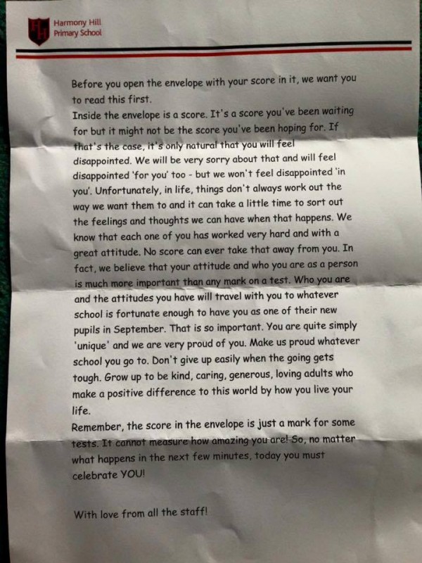 В Северной Ирландии при переходе из начальной школы в среднюю ученики сдают экзамены. От того, насколько успешно ты их сдал, зависит, в какой школе ты будешь учиться дальше. Результат приходит по почте. Вот какое письмо было вложено в конверты с оценками учеников начальной школы Harmony Hill: