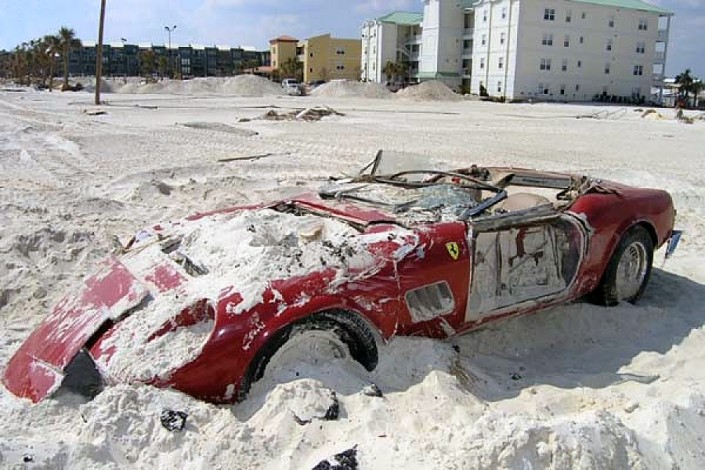 Еще одному Ferrari - на сей раз речь идет о редчайшем 250 GT Spyder - тоже не повезло. Купленный в 2008-м почти за 11 миллионов долларов "Спайдер" столкнулся с ураганом. Как видите, не выкарабкался - в таком состоянии его нашли на одном из калифорнийских пляжей.